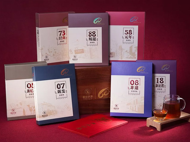 【歷程】禮盒內包含7盒茶磚及一冊茶廠發展廠史,分別是“58元年”、“73經典”、“88規范”、“05新紀元”、“07蛻變”、“08非遺”、“18新征程”。每一盒茶磚都意義深遠,它們分別對應茶廠60年發展歷程中七大重要豐碑性事件,記錄著茶廠60載歲月鎏金,見證著茶廠的成長,留下了濃濃的歲月印記。